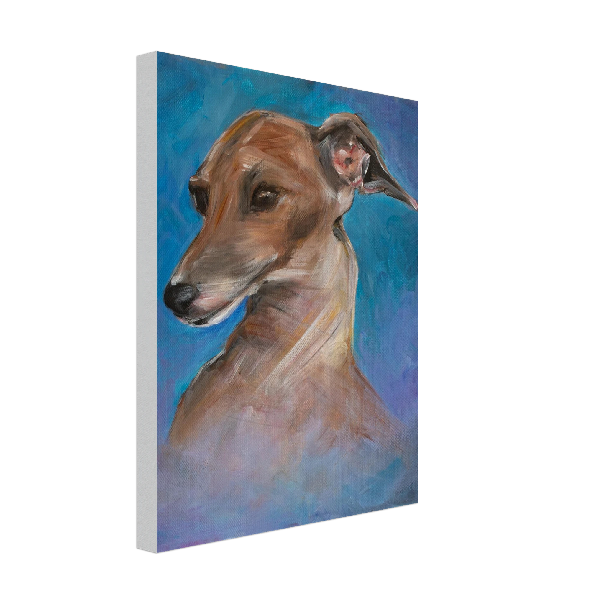 - Striking Emotional Focus: This expressive portrait of an Italian Greyhound captures the dog’s elegant poise and gentle character, brought to life with bold brushstrokes and warm, earthy tones against a vivid blue background. Printed on fine art canvas, it retains the painterly texture and depth of the original acrylic work, offering a gallery-quality piece that adds character and warmth to any home.