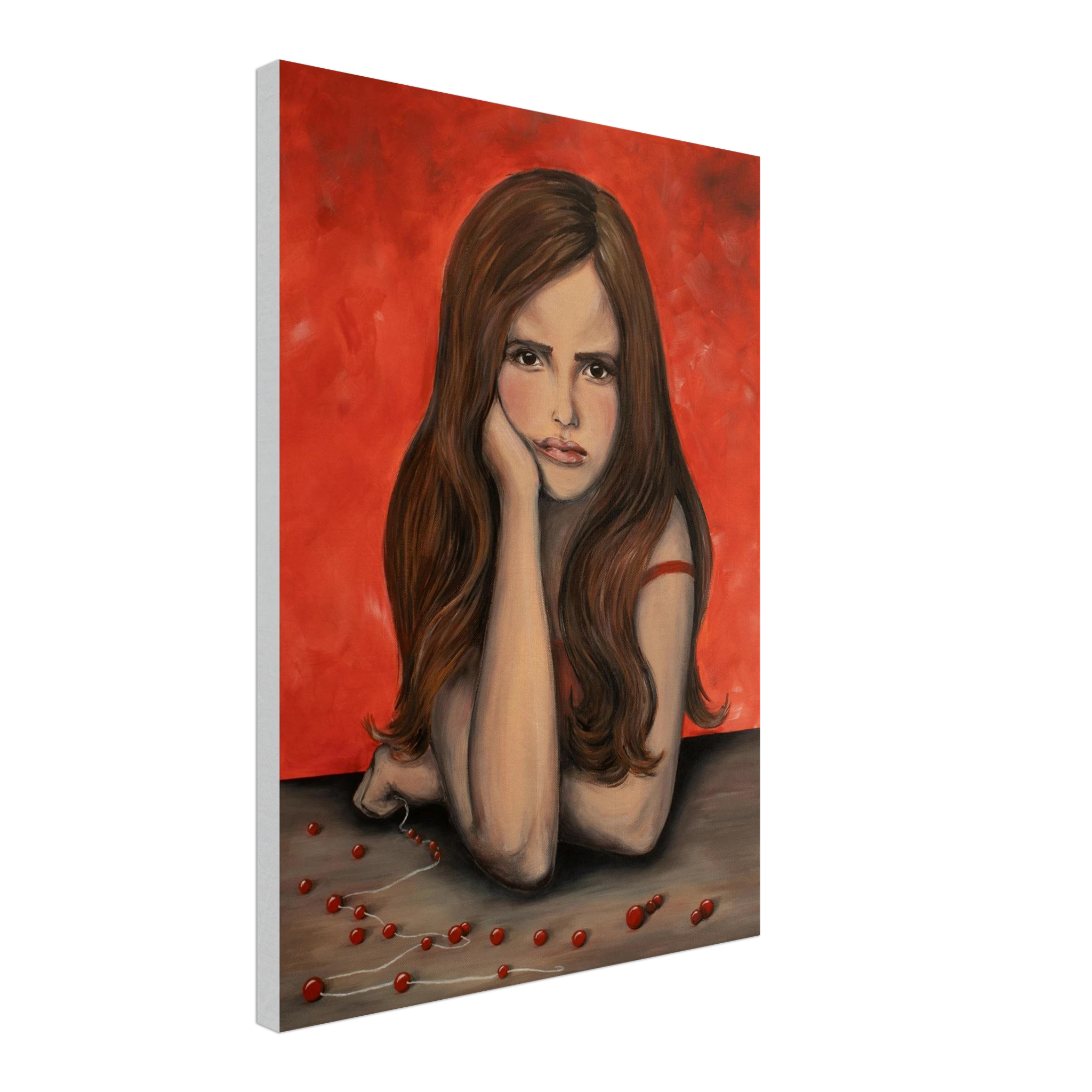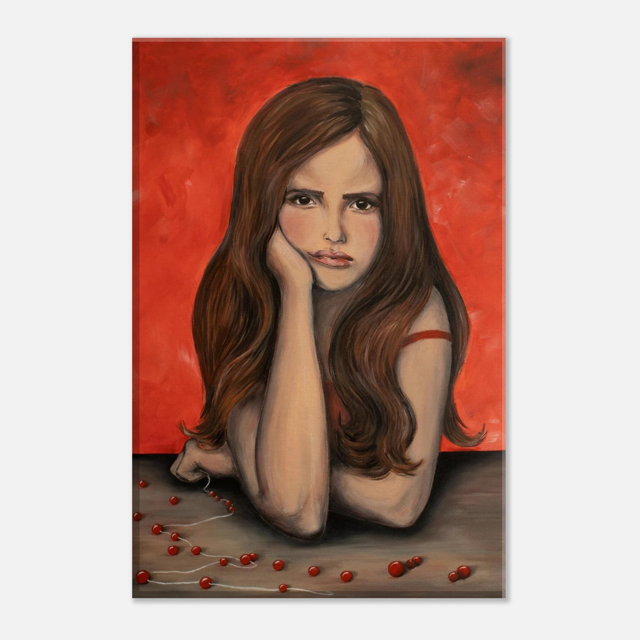 - Striking Emotional Focus: The painting vividly captures the intense red-orange background and the long, brown, flowing hair. With her chin resting in her hand, the young woman's expression suggests a moment of contemplation or melancholy. Scattered red beads lie on the table below her, adding a touch of narrative and visual interest. It's a piece perfect for those who are drawn to intimate emotional portrayals and strong, warm colour palettes.