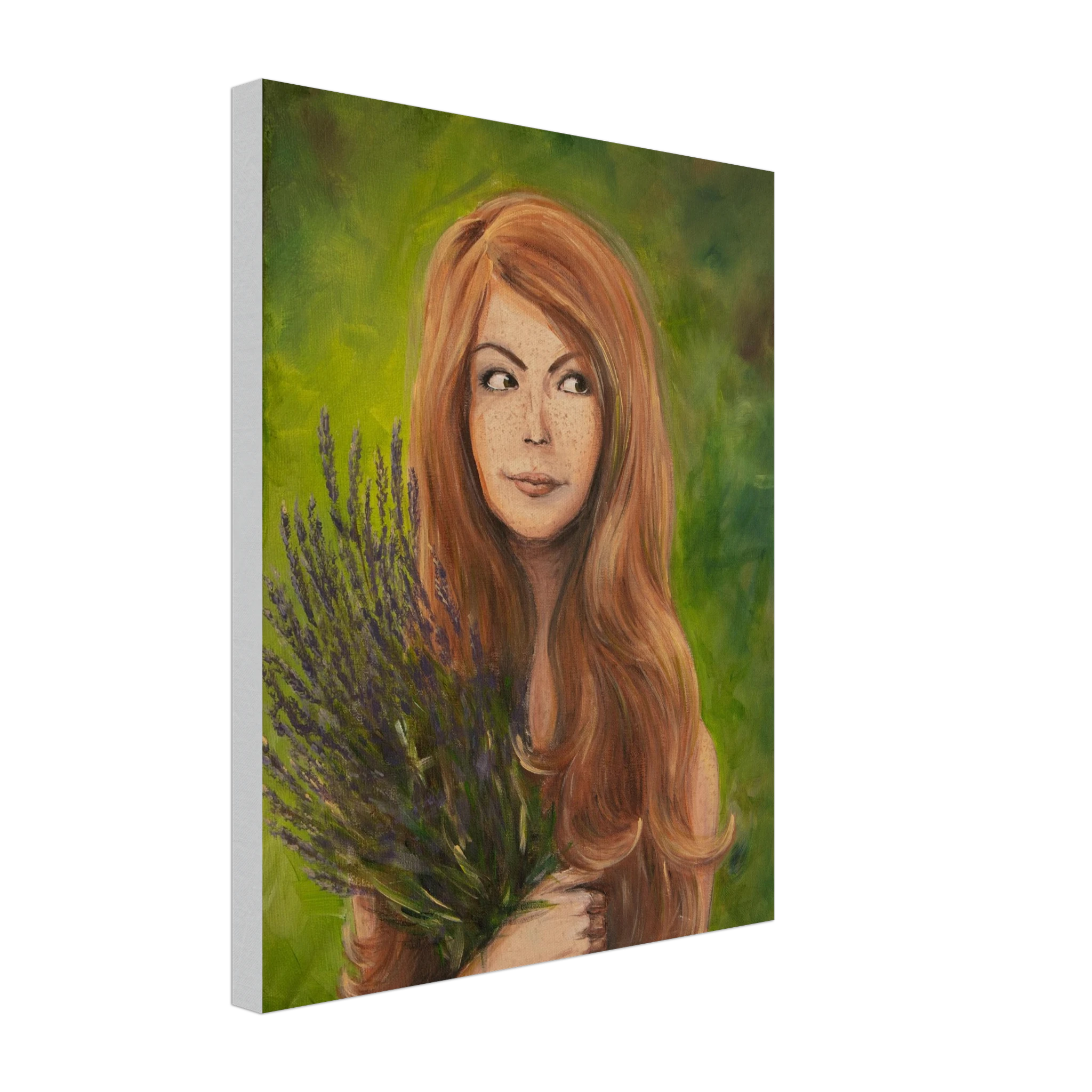 - Striking Emotional Focus: This vibrant portrait captures the figure's expressive gaze and freckled charm, brought to life with flowing brushstrokes and warm, reddish-brown hair against a lush, verdant green background. The delicate bouquet of lavender adds a touch of natural serenity. Printed on fine art canvas, it preserves the painterly texture and depth of the original acrylic work, making it a striking and refreshing addition to any home.