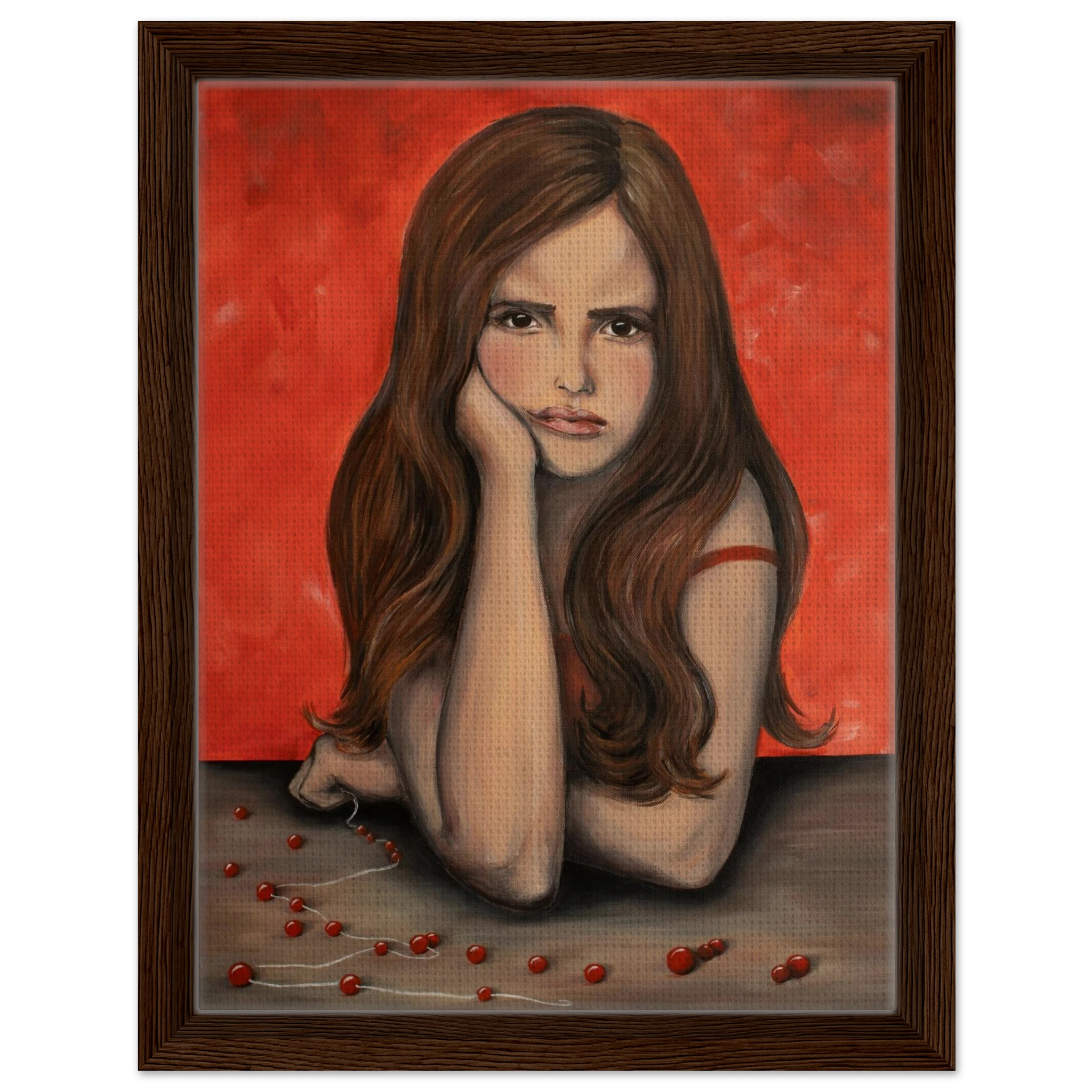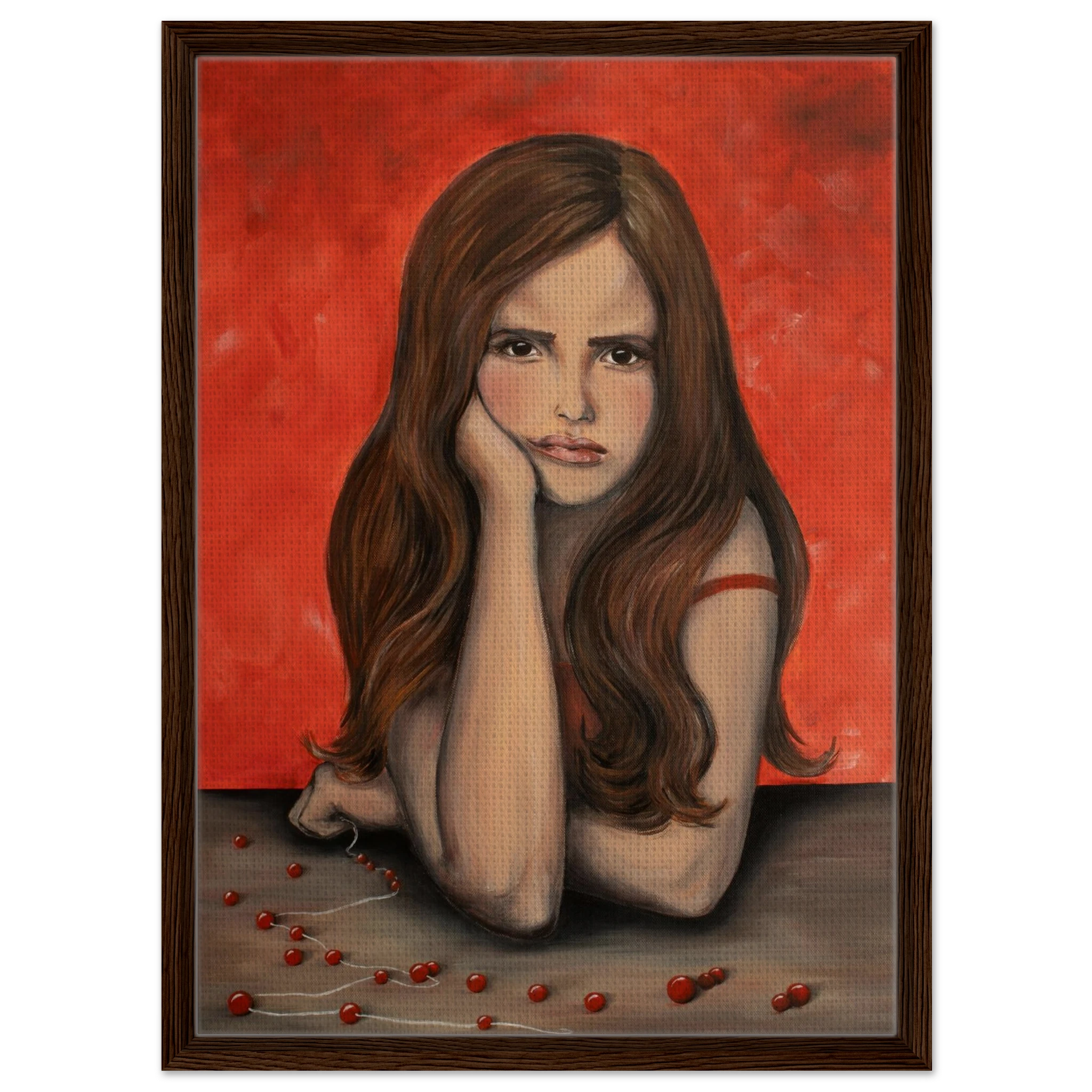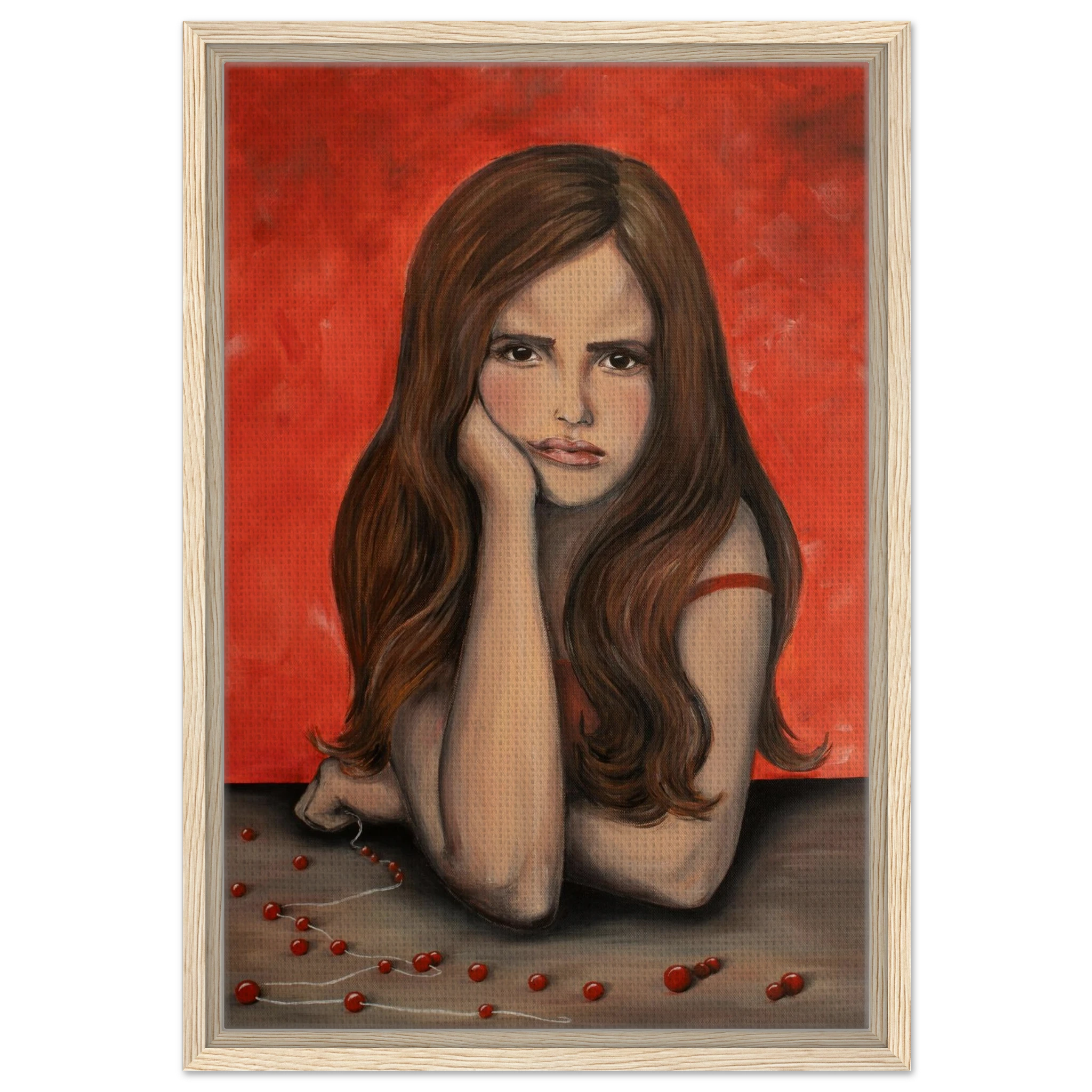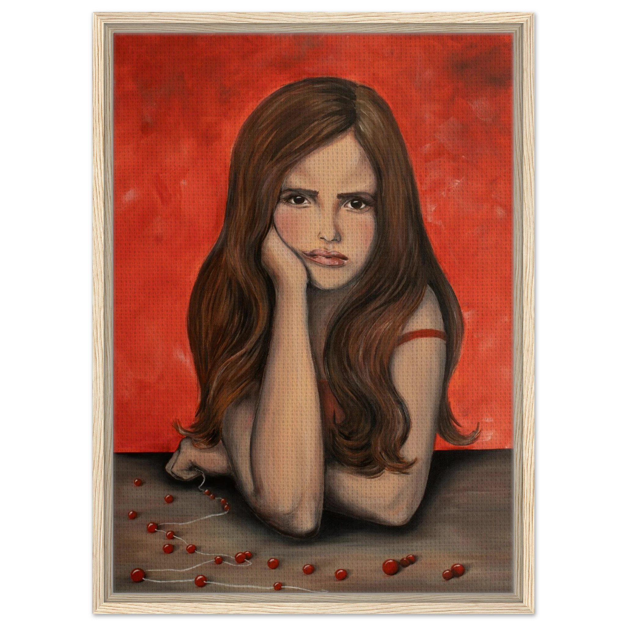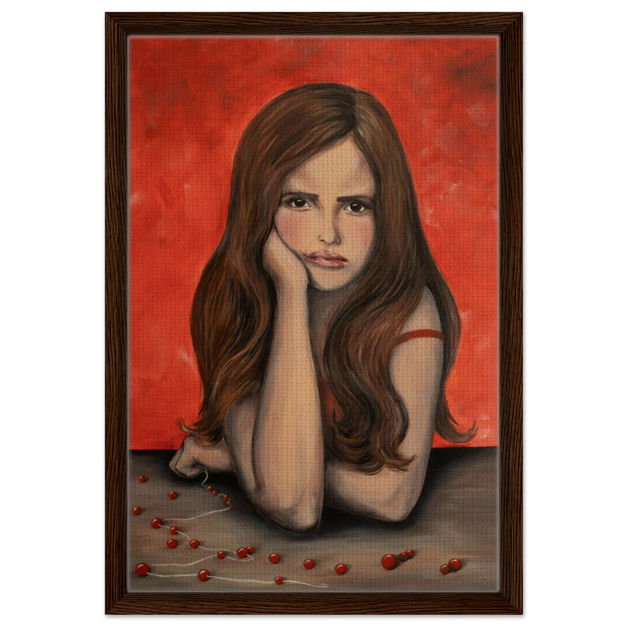 - Striking Emotional Focus: The painting vividly captures the intense red-orange background and the long, brown, flowing hair. With her chin resting in her hand, the young woman's expression suggests a moment of contemplation or melancholy. Scattered red beads lie on the table below her, adding a touch of narrative and visual interest. It's a piece perfect for those who are drawn to intimate emotional portrayals and strong, warm colour palettes.