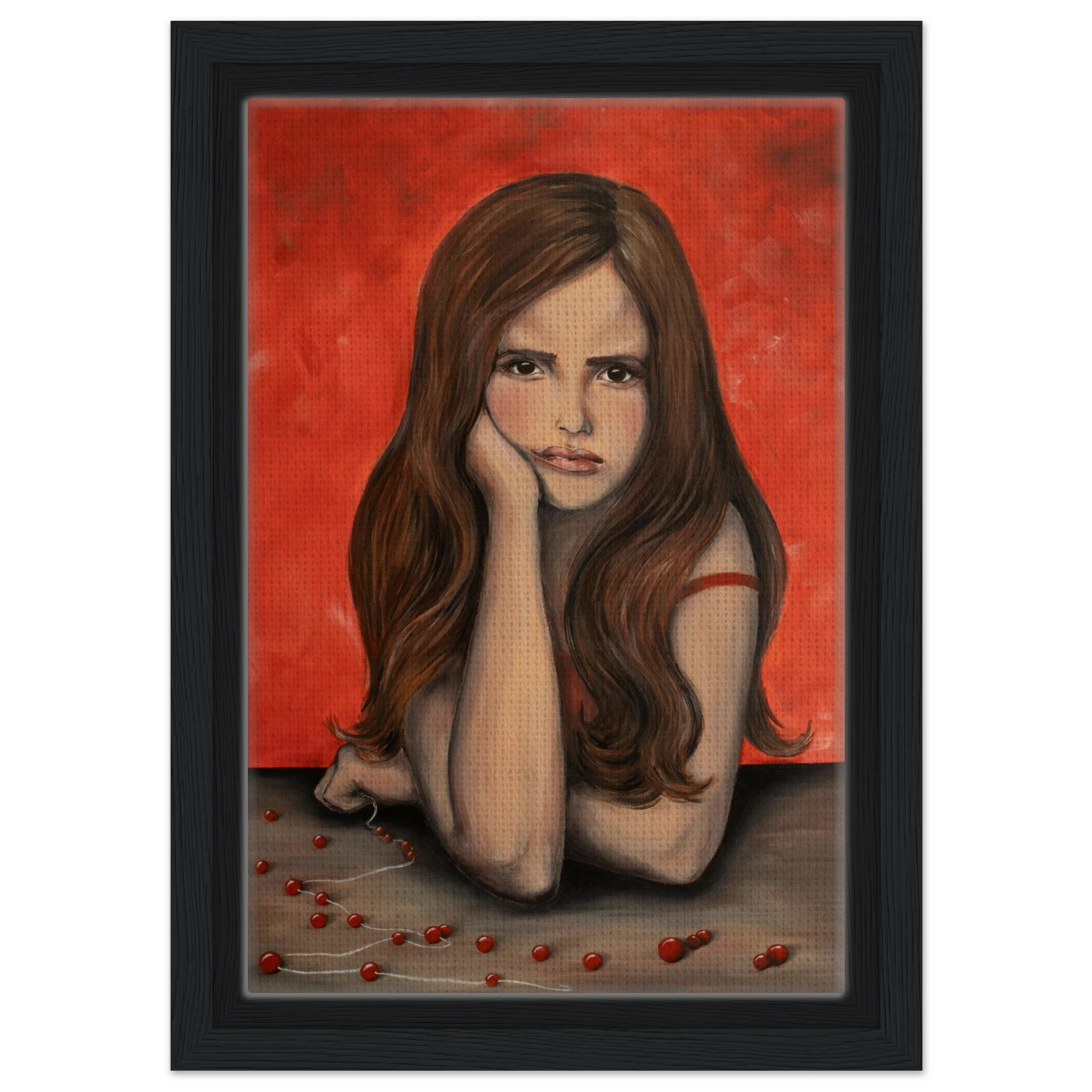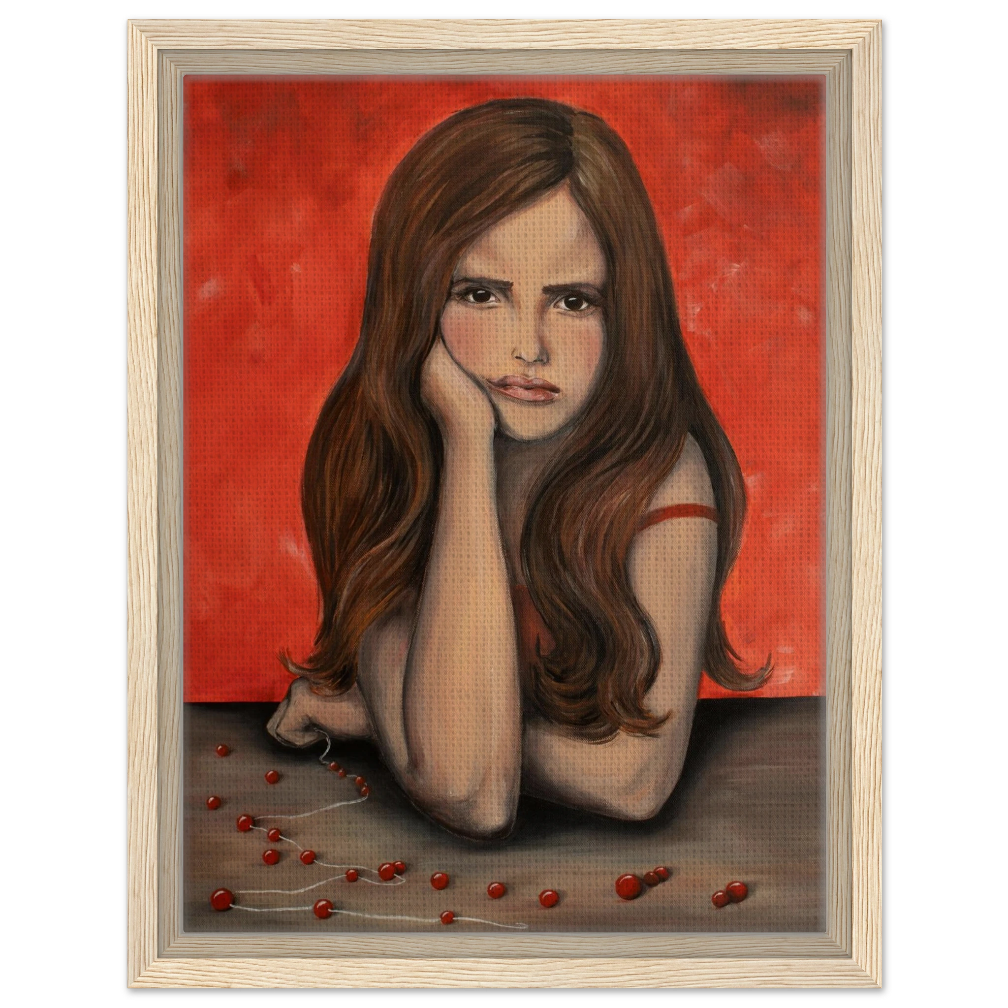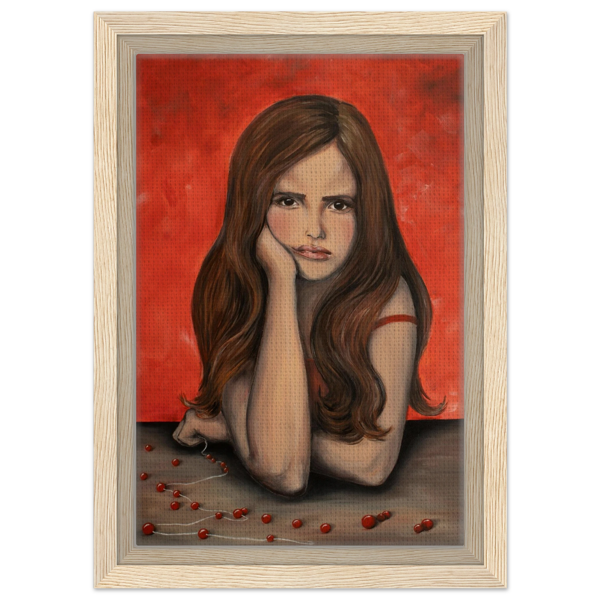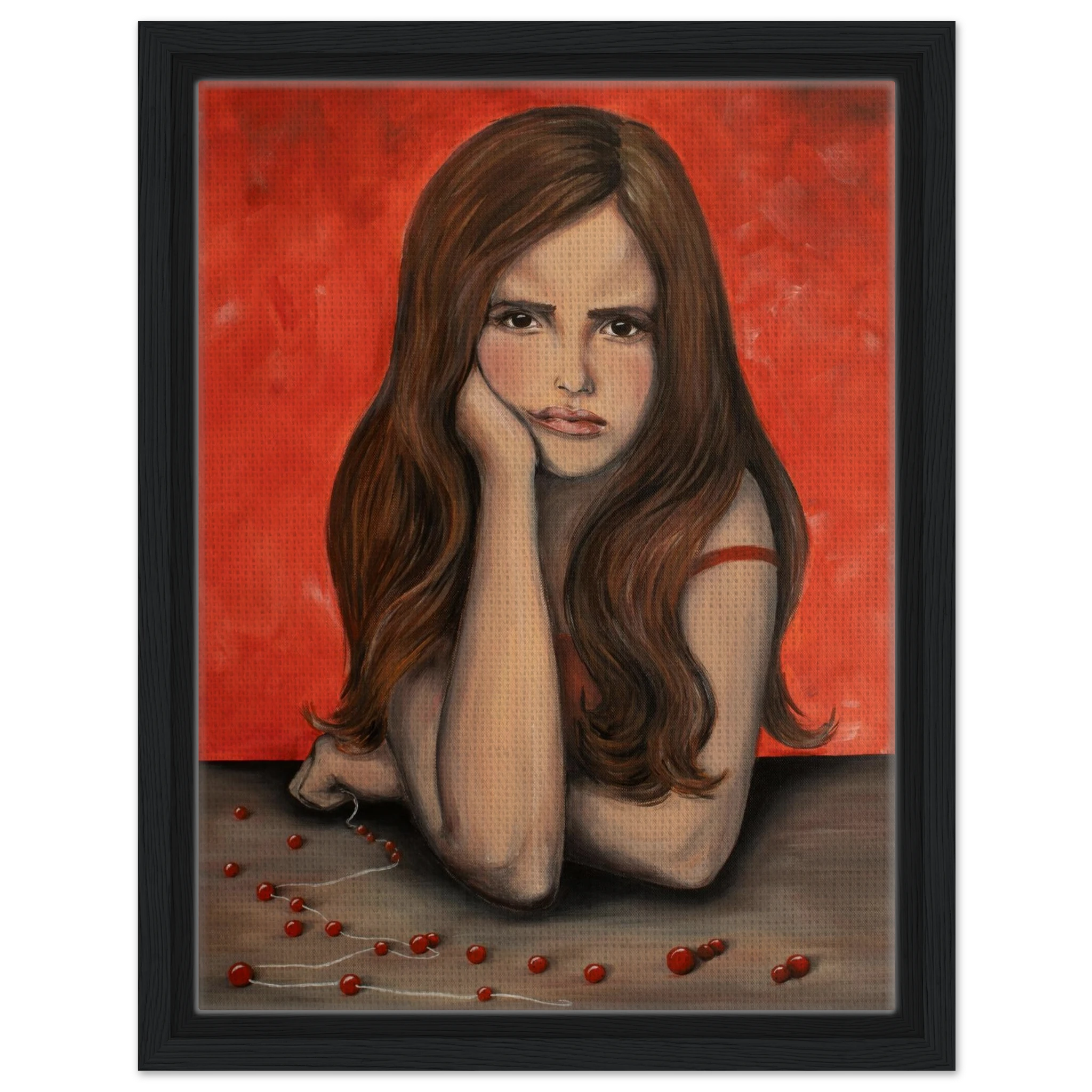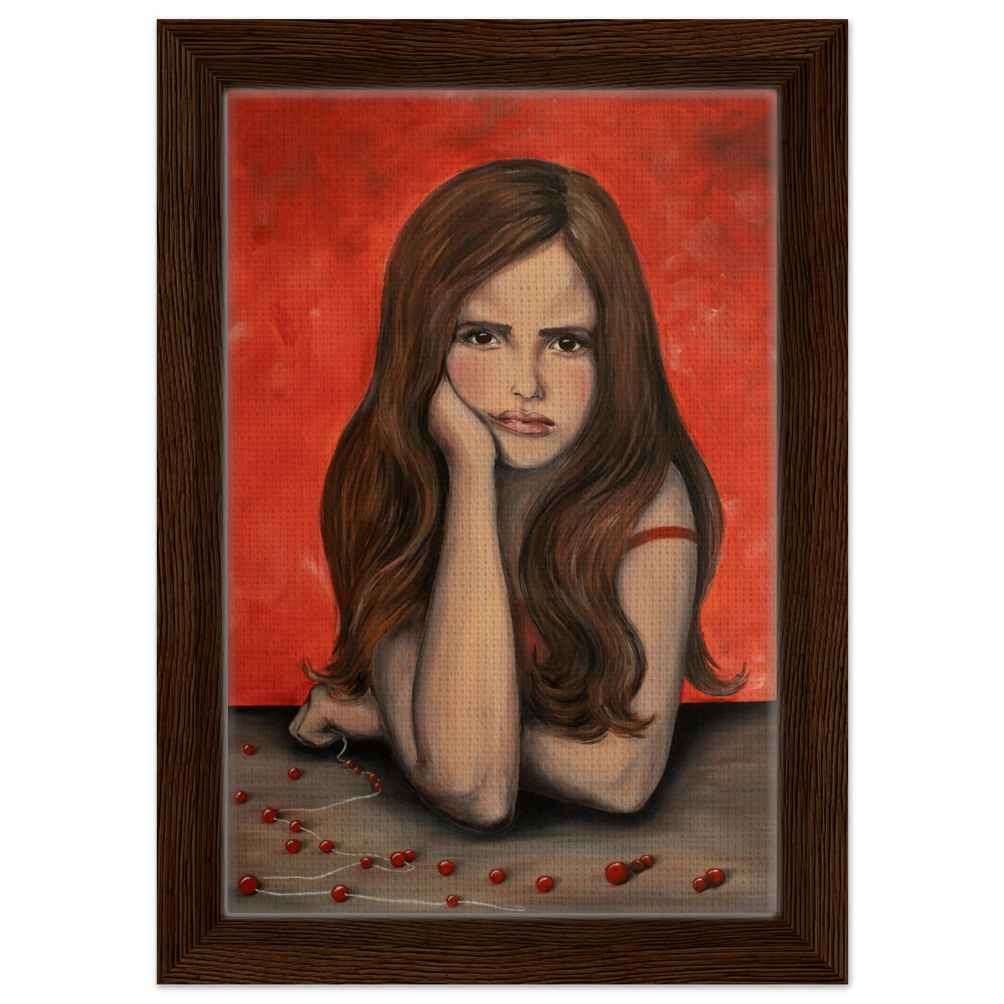 - Striking Emotional Focus: The painting vividly captures the intense red-orange background and the long, brown, flowing hair. With her chin resting in her hand, the young woman's expression suggests a moment of contemplation or melancholy. Scattered red beads lie on the table below her, adding a touch of narrative and visual interest. It's a piece perfect for those who are drawn to intimate emotional portrayals and strong, warm colour palettes.