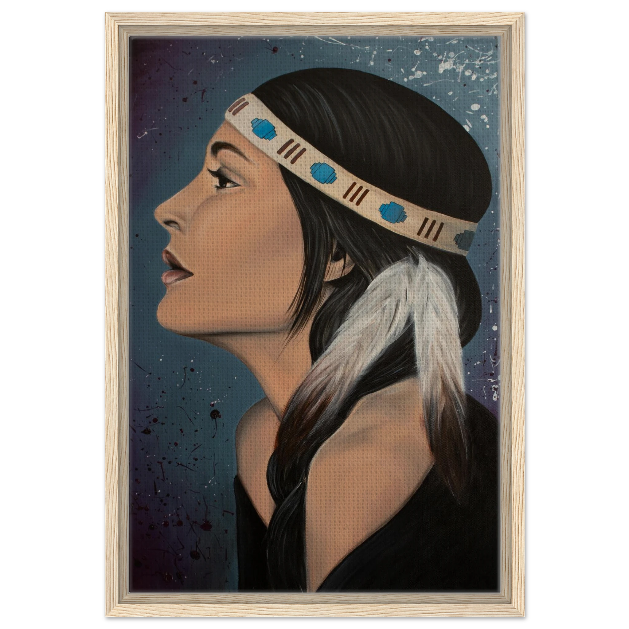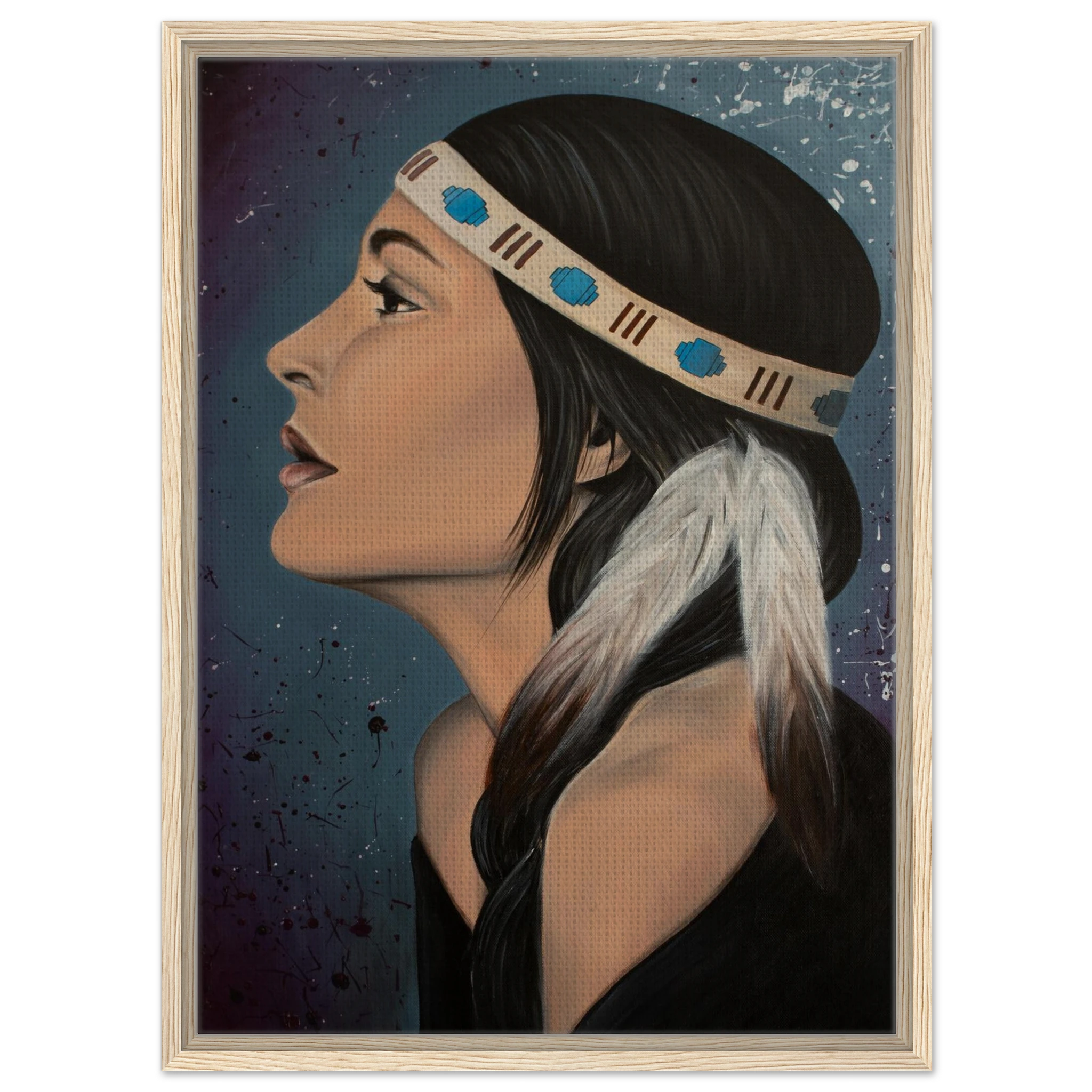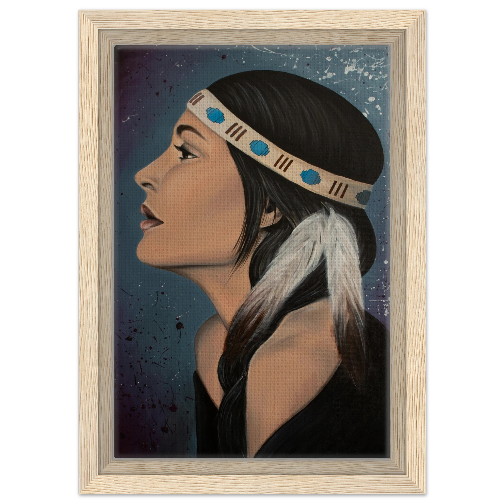 - Striking Emotional Focus: The painting captures a woman in profile, exuding dignity and grace. Her dark hair is adorned with a detailed headband featuring turquoise-like accents, and a long white feather adds a prominent, flowing detail. Set against a dramatic, dark background with dynamic white and purple splatter, the artwork balances a sense of tradition and contemporary artistic energy. It's an excellent choice for those who appreciate strong, thoughtful portraiture.