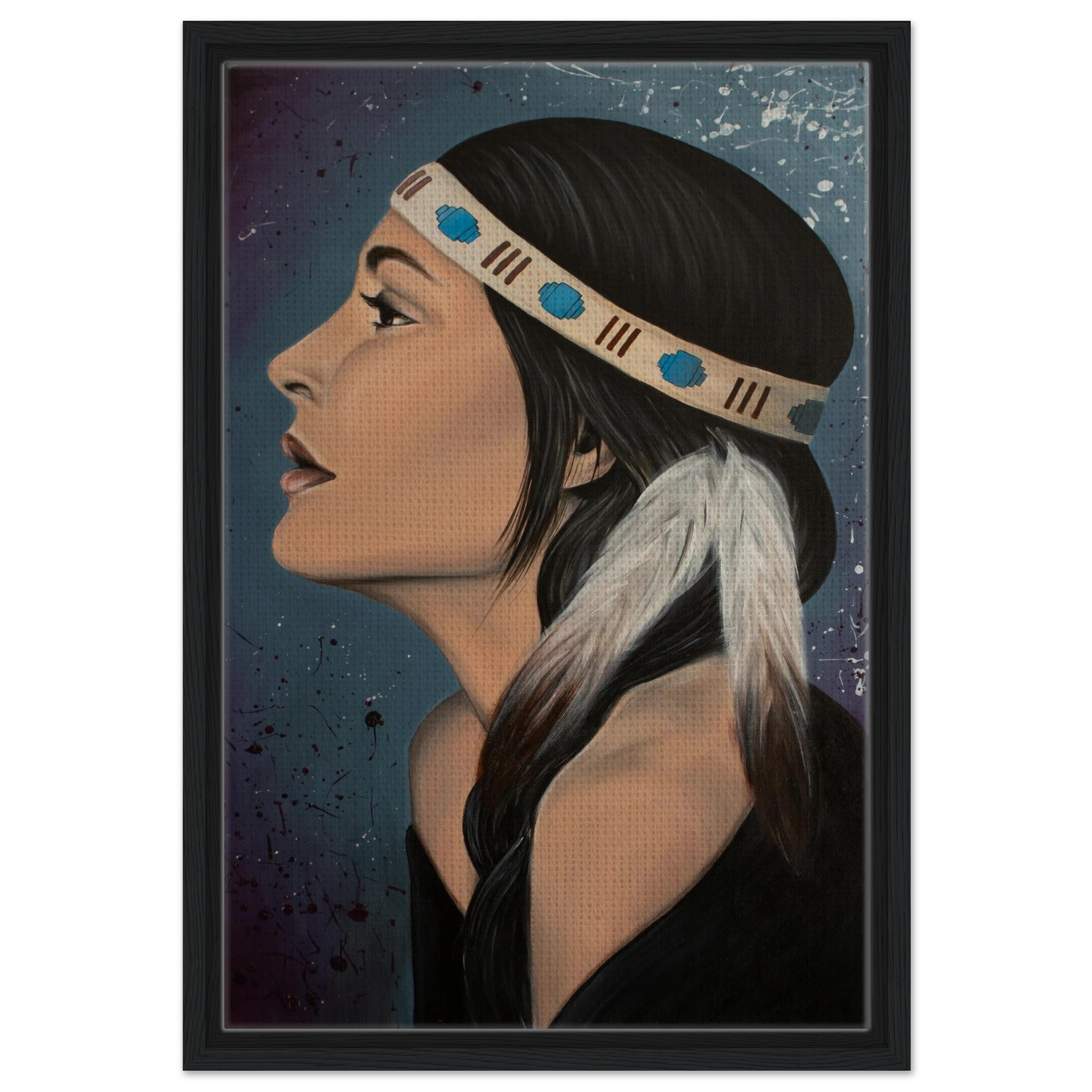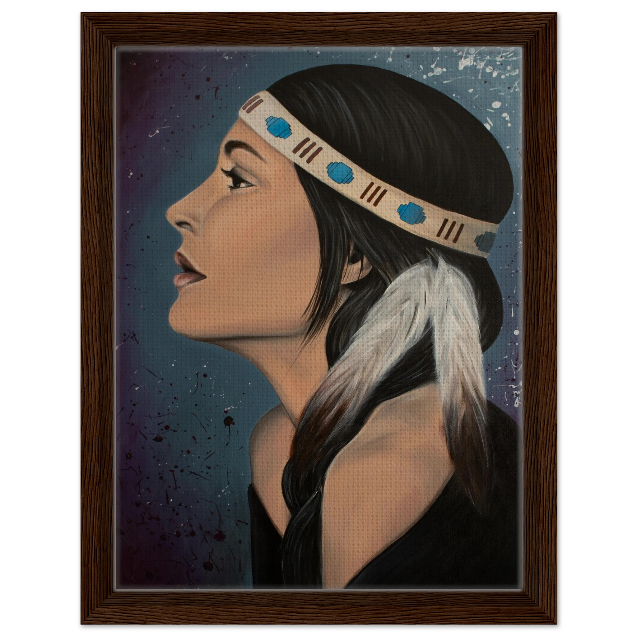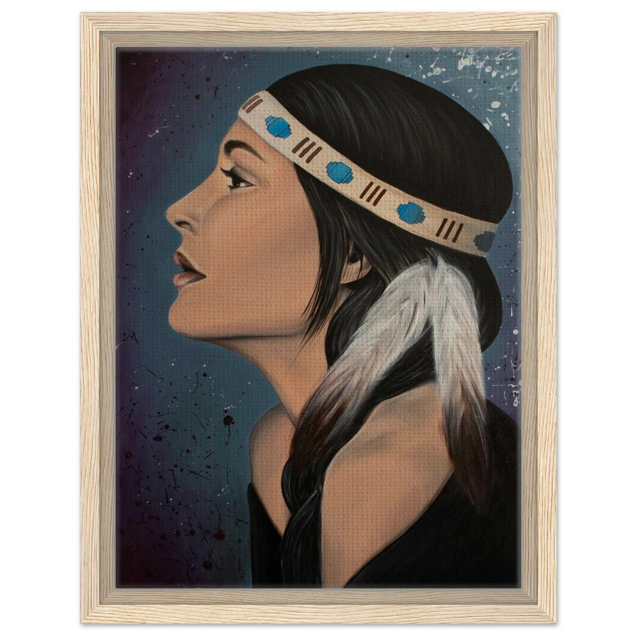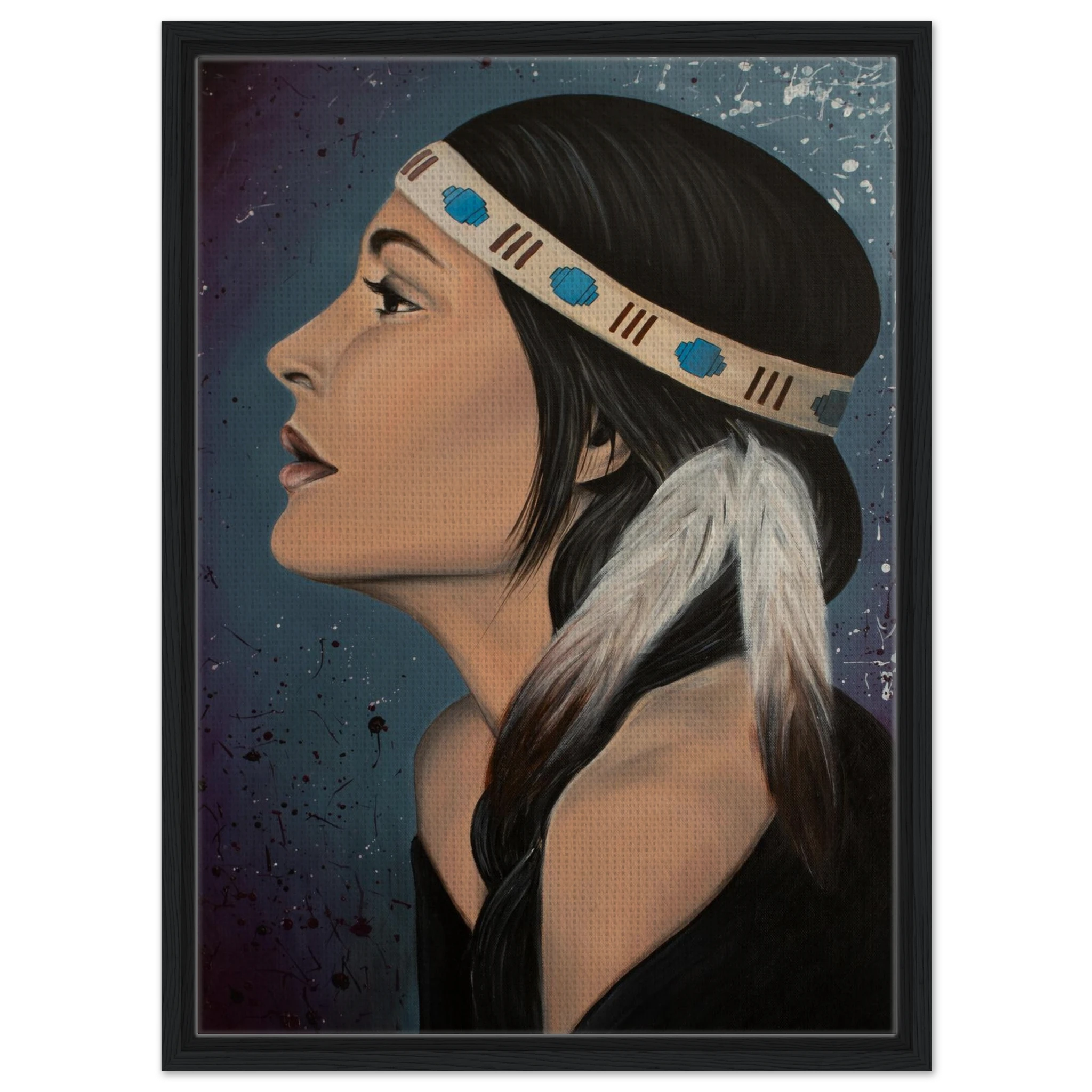 - Striking Emotional Focus: The painting captures a woman in profile, exuding dignity and grace. Her dark hair is adorned with a detailed headband featuring turquoise-like accents, and a long white feather adds a prominent, flowing detail. Set against a dramatic, dark background with dynamic white and purple splatter, the artwork balances a sense of tradition and contemporary artistic energy. It's an excellent choice for those who appreciate strong, thoughtful portraiture.
