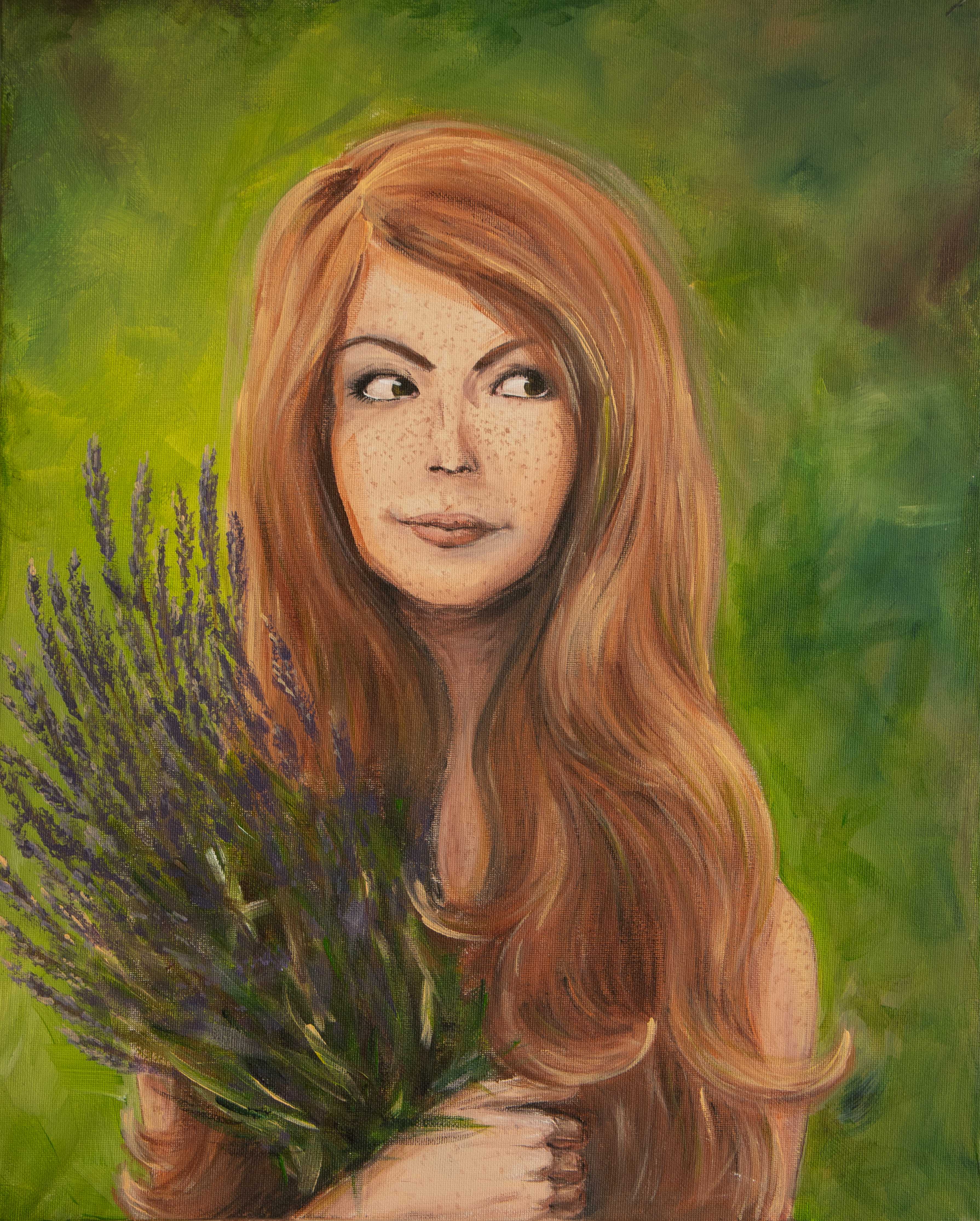 A portrait of youth, curiosity, and the simple joy of nature. The young woman, surrounded by the vibrant green of summer, holds a fresh bouquet of lavender close to her heart. Her playful gaze and the warm copper tones of her hair echo the scent and sunlight of a calm afternoon — a celebration of life’s quiet, fleeting beauty.