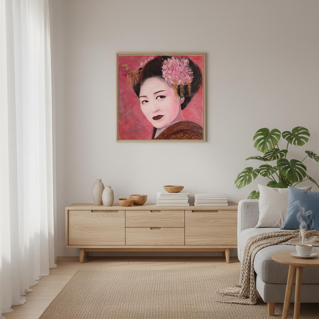 - Striking Emotional Focus: This portrait faithfully captures the vivid pink-red background and the intricate details of the geisha's attire and elaborate hair ornaments. With her serene gaze and delicate makeup, she embodies a moment of poised elegance and traditional beauty. It is perfect for those who are drawn to cultural artistry, symbolism, and timeless grace. Printed on a museum-quality matte paper, it preserves the painterly texture and depth of the original acrylic work, making it a striking and tranquil addition to any home.