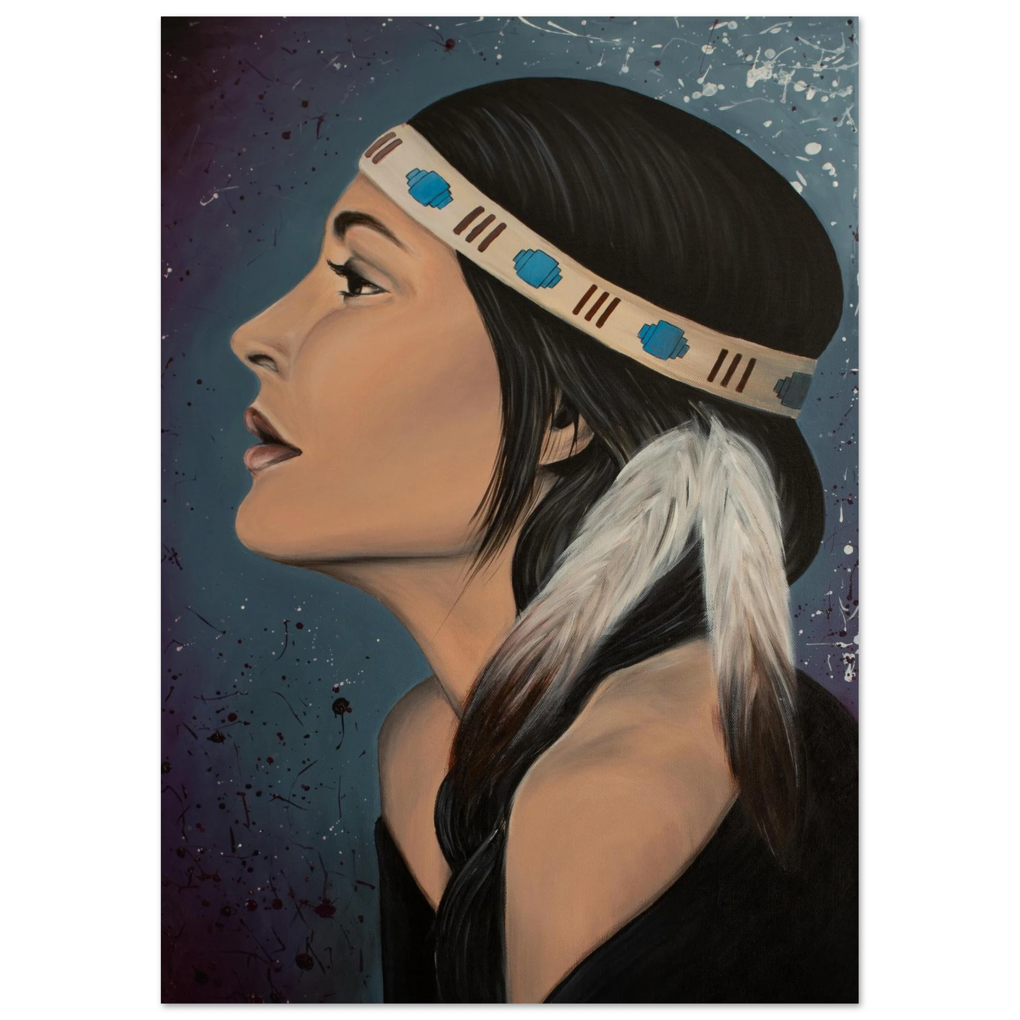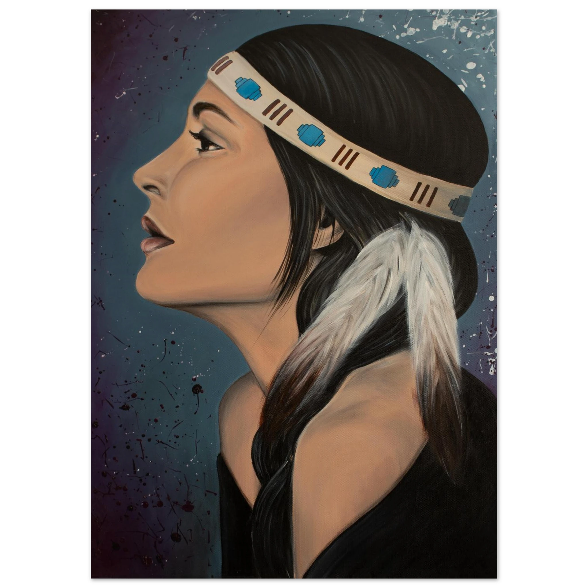 - Striking Emotional Focus: The painting captures a woman in profile, exuding dignity and grace. Her dark hair is adorned with a detailed headband, and a long white feather adds a prominent, flowing detail. Set against a dramatic, dark background with dynamic white and purple splatter, the artwork balances a sense of tradition and contemporary artistic energy. It's an excellent choice for those who appreciate strong, thoughtful portraiture. Printed on a museum-quality matte paper, it preserves the painterly texture and depth of the original acrylic work, making it a striking and tranquil addition to any home.
