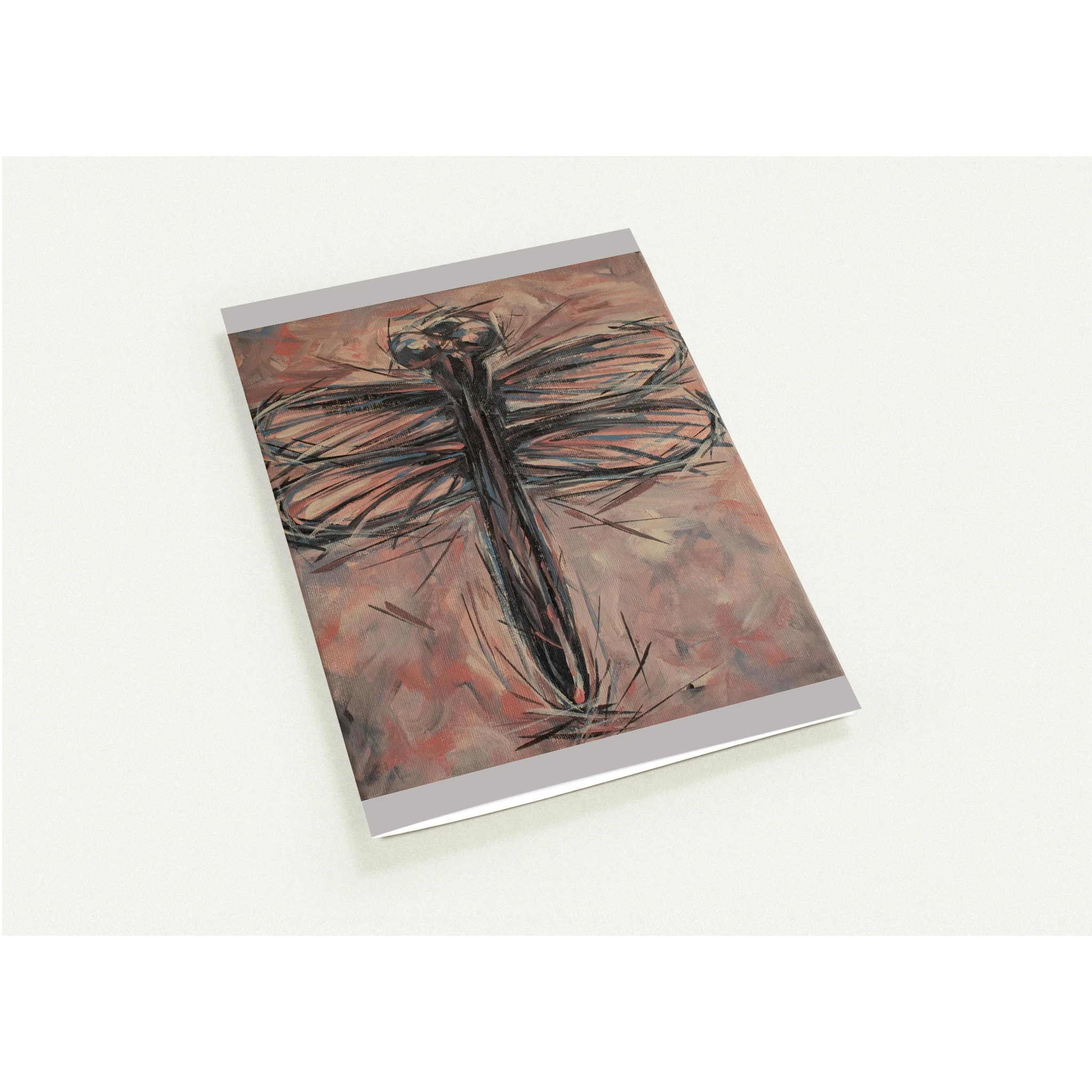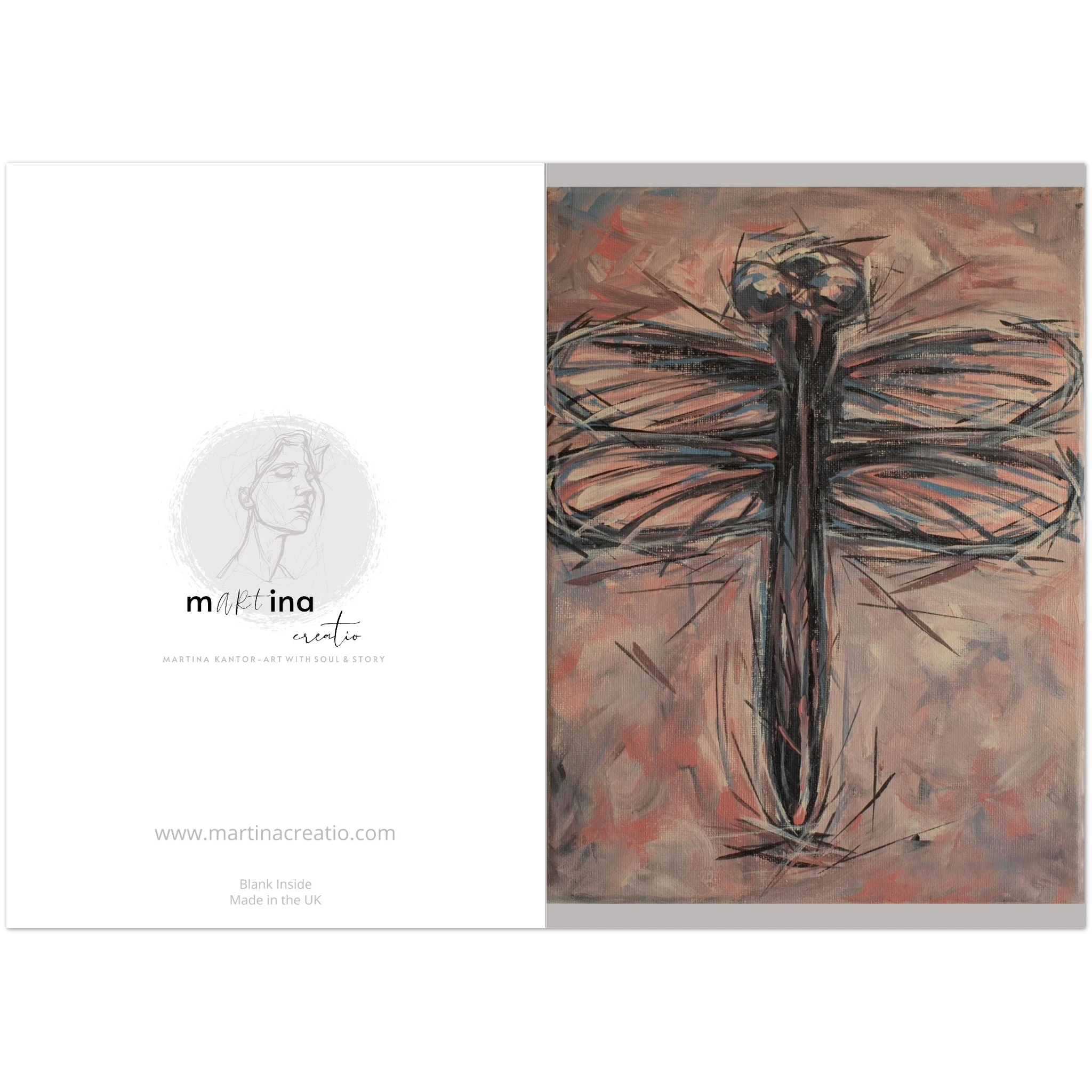- Miniature Fine Art: This isn’t your average postcard. It’s a high-quality print that captures the dynamic essence of a dragonfly in flight through bold, expressive brushstrokes. Dark, swirling lines and touches of cool blue-grey suggest the creature’s form against a soft blush pink and white background, evoking the serene yet energetic movement of the original “Dance of the Dragonfly” painting. It’s a beautiful, affordable way to own a piece of original art brimming with emotion and depth.