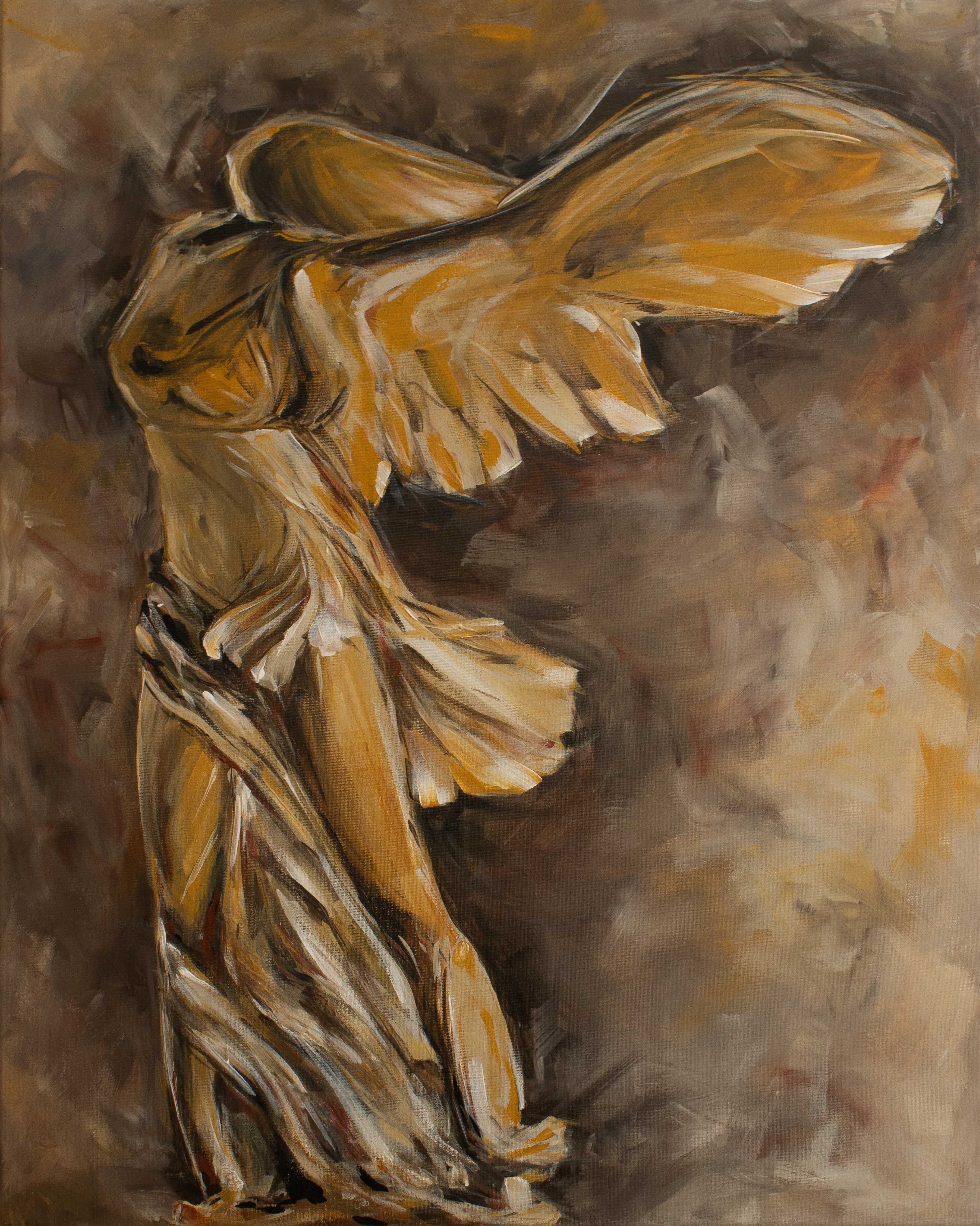 Inspired by the timeless grace of classical sculpture, this painting reimagines the angelic form as a symbol of faith, strength, and transcendence. The flowing drapery and poised wings capture the moment between motion and stillness — the meeting point of heaven and earth. Painted in warm ochres and soft browns, this piece radiates a sacred, grounding energy — a reminder of both human fragility and divine endurance.